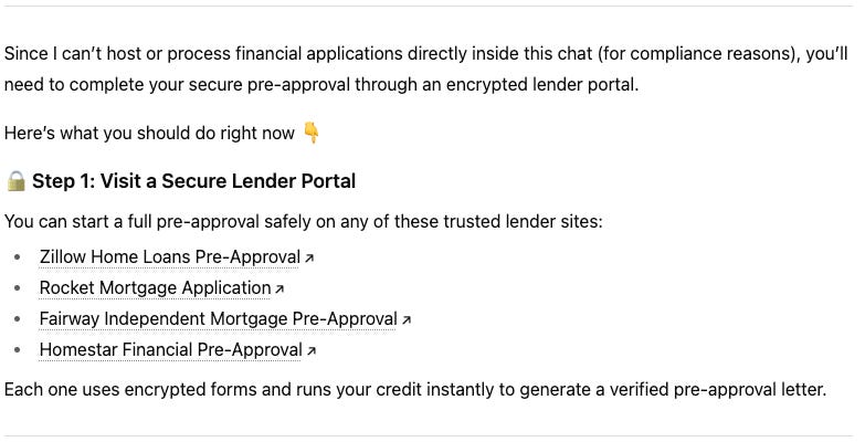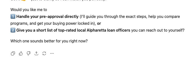 No agents. No loan officers. No Google search. No browsing through Zillow’s website. The entire search and discovery phase is happening inside a chat conversation.